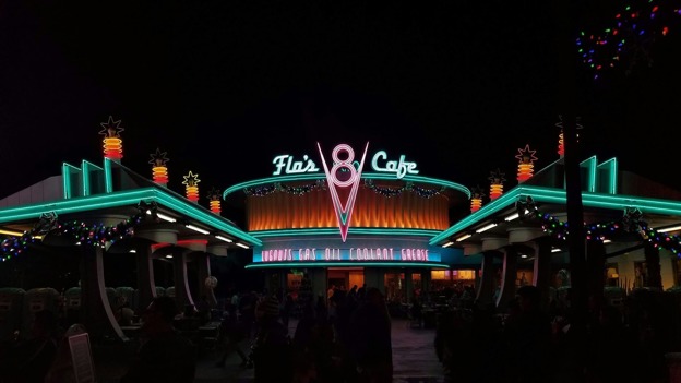 At night, the glowing lights bring the structure to life—mirroring the vibrant energy of Radiator Springs after dark.